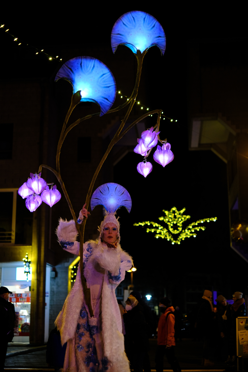 Silya bringt mit ihrem Lichterbaum das wunderschöne Innenleben von Blumen, Blüten und Edelsteinen zum Leuchten. Das Weiß ihres Gewandes hebt die zarten Farben und Formen dieser filigranen Wunder besonders hervor. Ein Anblick der das Publikum berührt und verzaubert.