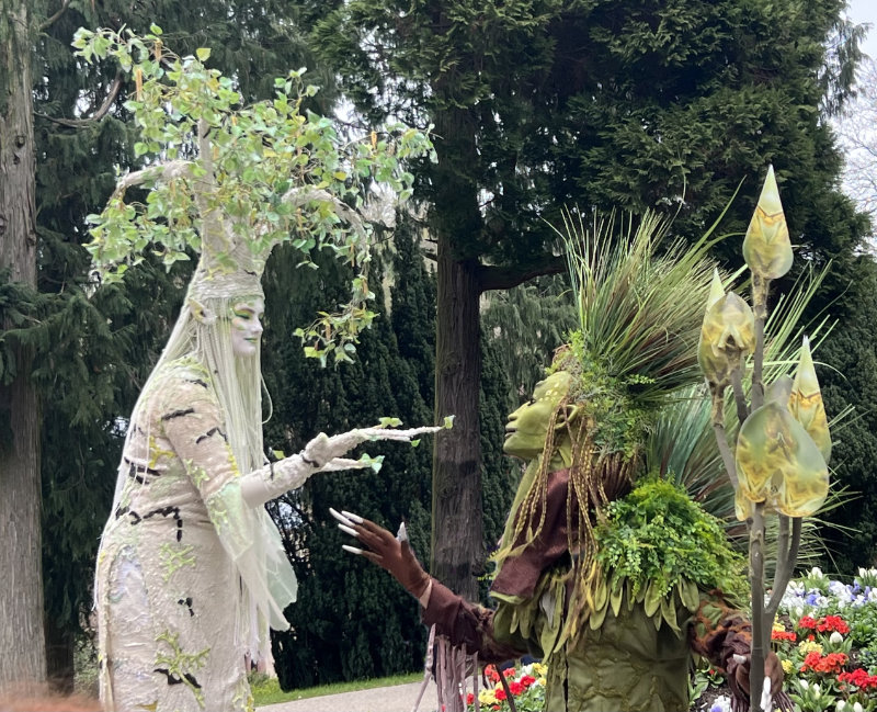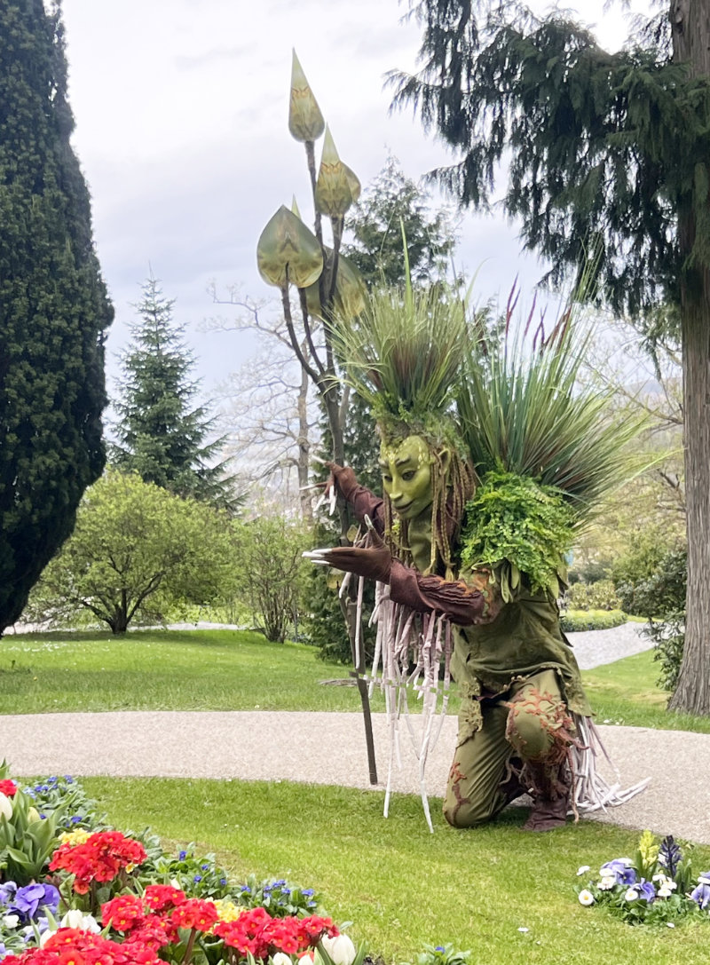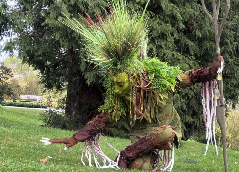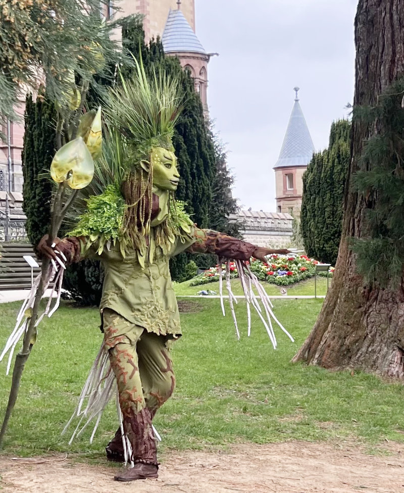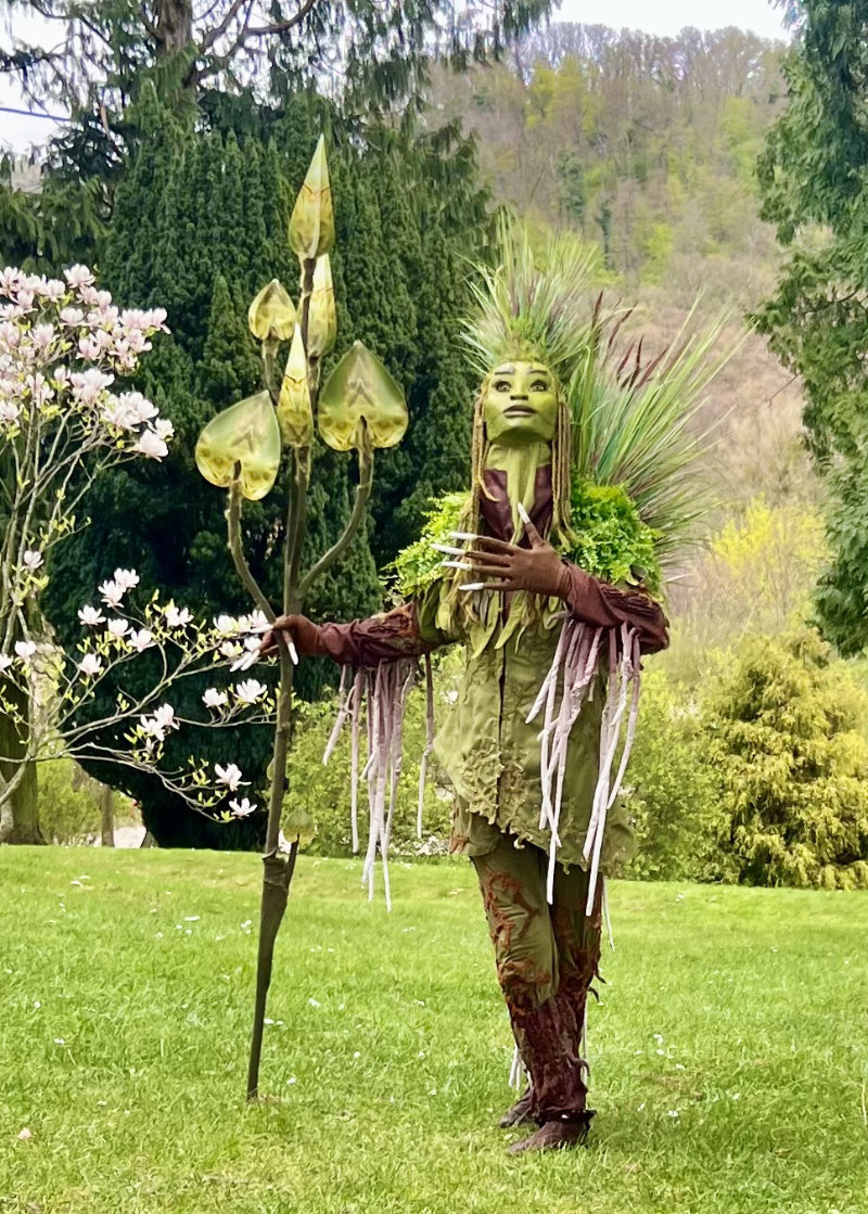 Mit innerer Ruhe und tiefer Verbundenheit schreitet der Hüter der Gräser von Baum zu Strauch, von Strauch zu Kraut, von Kraut zu Gras, und segnet die grüne Pflanzenwelt mit sanfter Achtsamkeit. Die Präsenz dieses großen grünen Wesens öffnet einen meditativen, wohltuenden Raum, der die Zuschauer fasziniert in den Moment eintauchen lässt.