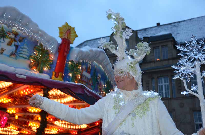 Premiere mit Blütenlicht auf dem Mannheimer Weihnachtsmarkt 2017. Als Sprößling von Väterchen Frost und einer Waldelfe verkörpert dieser edle Eisblumenelf den weißen Winter in seiner ganzen Pracht. Zu sphärischer Musik zieht er zwischen den Jahren durchs Land, lässt es ab und an mal kräftig schneien oder entzückt durchs verschenken von leuchtenden Blütenlichtern.